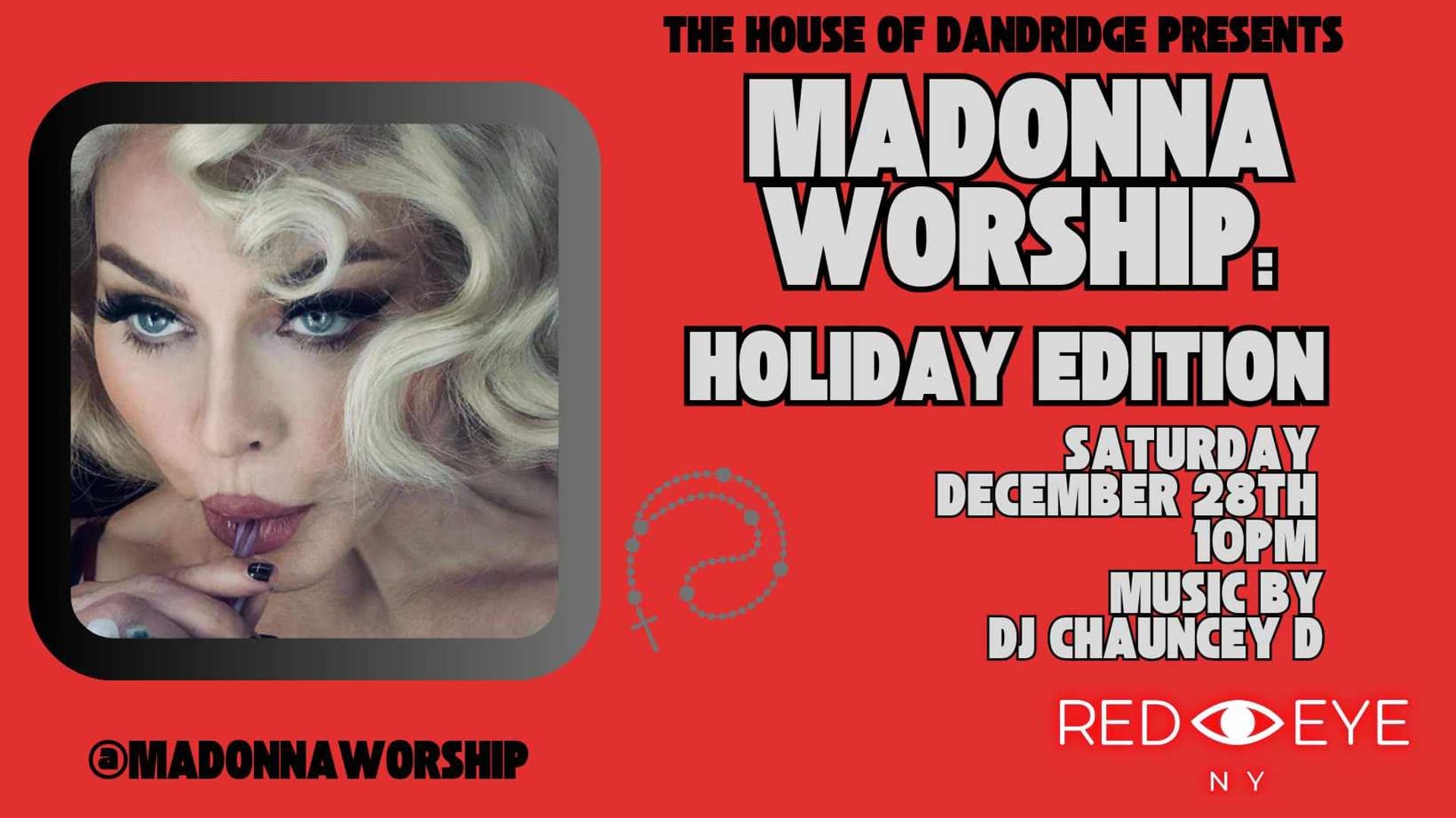 After taking his Madonna Worship party on tour this Winter/Spring to coincide with Madonna’s Celebration Tour, making stops in Houston, Miami, Denver and eventually Fire Island, The House Of Dandridge has garnered quite a reputation for being one of the most unique and creative events celebrating the legacy of Madonna, The Queen of Pop! DJ Chauncey D spins Madonna tracks and remixes, from rare to popular, from within her entire 40+ year career to a jubilant, packed to a capacity crowd of Madonna super-fans and novices alike. After an amazing year filled with Madonna Worship parties all across the country and multiple NYC locations, The House Of Dandridge ends a banner year with one last celebration at RedEye NY in the heart of Manhattan’s Hell’s Kitchen