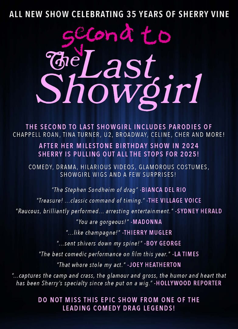 The Second To Last Showgirl includes parodies of Chappell Roan, Tina Turner, U2, Broadway, Celine, Cher and more. After her milestone birthday show in 2024, Sherry is pulling out all the stops for 2025. Comedy, drama, hilarious videos, glamorous costumes, showgirl wigs and a few surprises. Do not miss this epic show from one of the leading comedy drag legends!